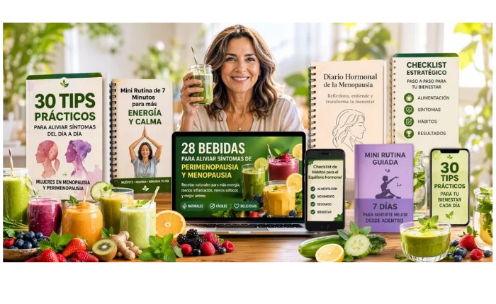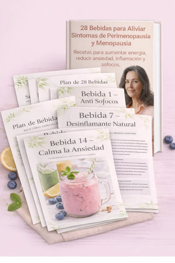 Encontrarás 28 recetas de jugos, licuados, tés y bebidas naturales especialmente diseñados por módulos para aliviar síntomas como ansiedad, inflamación, sofocos y aumentar energía . Cada receta incluye ingredientes, preparación paso a paso y beneficios específicos, más los 4 bonos de regalo. (diario hormonal, hábitos saludables, Mini rutina de 7 minutos, 30 tips para alivio de síintomas del dia dia)